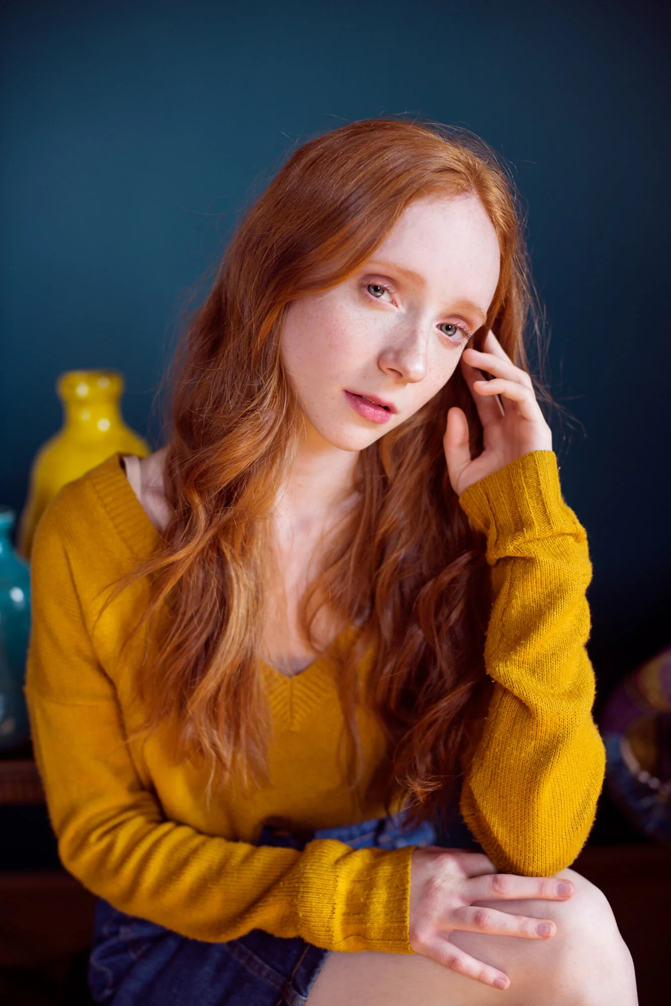We hired The Clock Tower Studio in London as I knew they had some beautifully painted bold colourful walls and bright furniture which would work really well with Bina’s gorgeous ginger hair. I asked her to bring along some colourful clothing as well to really make the photos pop!
